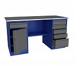 Верстак металлический двухтумбовый, PROFFI-216 Т Д5. Размеры: 870х1600х700мм, 1 тумба - 5 ящиков,1 тумба с дверью (2 полки), замки, полка, оцинк. столешница h=24 мм (фанера+оцинкованный металл 1мм). Нагрузка на столешницу 300кг.