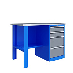 Однотумбовый. Допустимая нагрузка на столешницу 750 кг. Опорные элементы выполнены сварными из холоднокатаной стали. Верстак состоит из столешницы, опоры, тумбы P4 с двумя малыми и двумя большими ящиками, полки-стенки и одинарного экрана с кронштейнами. Все металлические элементы покрыты полиэфирной порошковой краской. Столешница из фанеры марки ФСФ толщиной 24 мм, которая покрыта лаком-антисептиком и листом оцинкованной холоднокатаной стали толщиной 1,2 мм. Размеры (ВхШхГ) 1470x1196x696 мм.