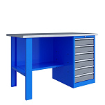 Однотумбовый. Допустимая нагрузка на столешницу 750 кг. Опорные элементы выполнены сварными из холоднокатаной стали. Верстак состоит из столешницы, опоры, тумбы P5 с четырьмя малыми и одним большим ящиком, полки-стенки, двойного экрана с кронштейнами. Столешница состоит из фанеры марки ФСФ толщиной 24 мм, которая покрыта лаком-антисептиком и листом оцинкованной холоднокатаной стали толщиной 1,2 мм. Размеры (ВхШхГ) 1965x1396x696 мм.