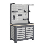 Нагрузка на столешницу 1500 кг. Столешница из листа влагостойкой фанеры марки ФСФ толщиной 40 мм и листом горячекатаной стали толщиной 5 мм. Рама верстака выполнена их холоднокатаной стали. Модуль верстака выполнен сварными. Ящики в модулях устанавливаются на шариковых телескопических направляющих полного выдвижения. Квадратная перфорация для установки крючков, держателей. Размеры: 1982x1993x743 мм.