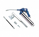 Шприц для смазки пневматический для шприцевания консистентной смазкой – 5 предметов. Объем бака – 0,5л. При давлении воздуха 2-8атм давление смазки 80-400 атм максимально. Набор: нагнетатель, емкость для смазки, мягкий и жесткий наконечник, адаптер для подключения 1/2”.