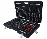 Набор инструментов в чемодане 1/4" & 1/2" 6-гранный 156 предметов. В наборе: головки 1/2", 1/4" (6РТ), головки глубокие 1/2", 1/4" (6РТ), головки TORX 1/2", 1/4", трещотка 1/2", 1/4", удлинитель 1/2", 1/4", кардан 1/2", 1/4", вороток-отвертка 1/4", держатель для бит 1/4", переходник 3/8", свечная головка 1/2" (6РТ и 12РТ), держатель для бит 5/16", вороток с шарниром 380 мм, вороток Г-образный 260 мм, биты 1/4", биты 5/16", ключи рожково-накидной: 6-24 мм, ключи разрезные, Г-образный ключ HEX, пассатижи 7", бокорезы 6", клещи с фиксатором 10", молоток 500 г, набор выколоток и зубил, отвертки с антискользящей рукояткой.