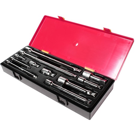 Набор удлинителей в прочном презентабельном боксе 8 предметов. В комплекте: удлинители 1/2": 2", 3", 5", 10" - 4 шт.;переходник карданный 1/2" - 1 шт; вороток 1/2" с шарниром 15" - 1 шт; вороток 1/2" с плавающей головкой 12" - 1 шт; трещотка на шарнире с фиксатором 1/2" - 1 шт. Квадрат присоединения 1/2"