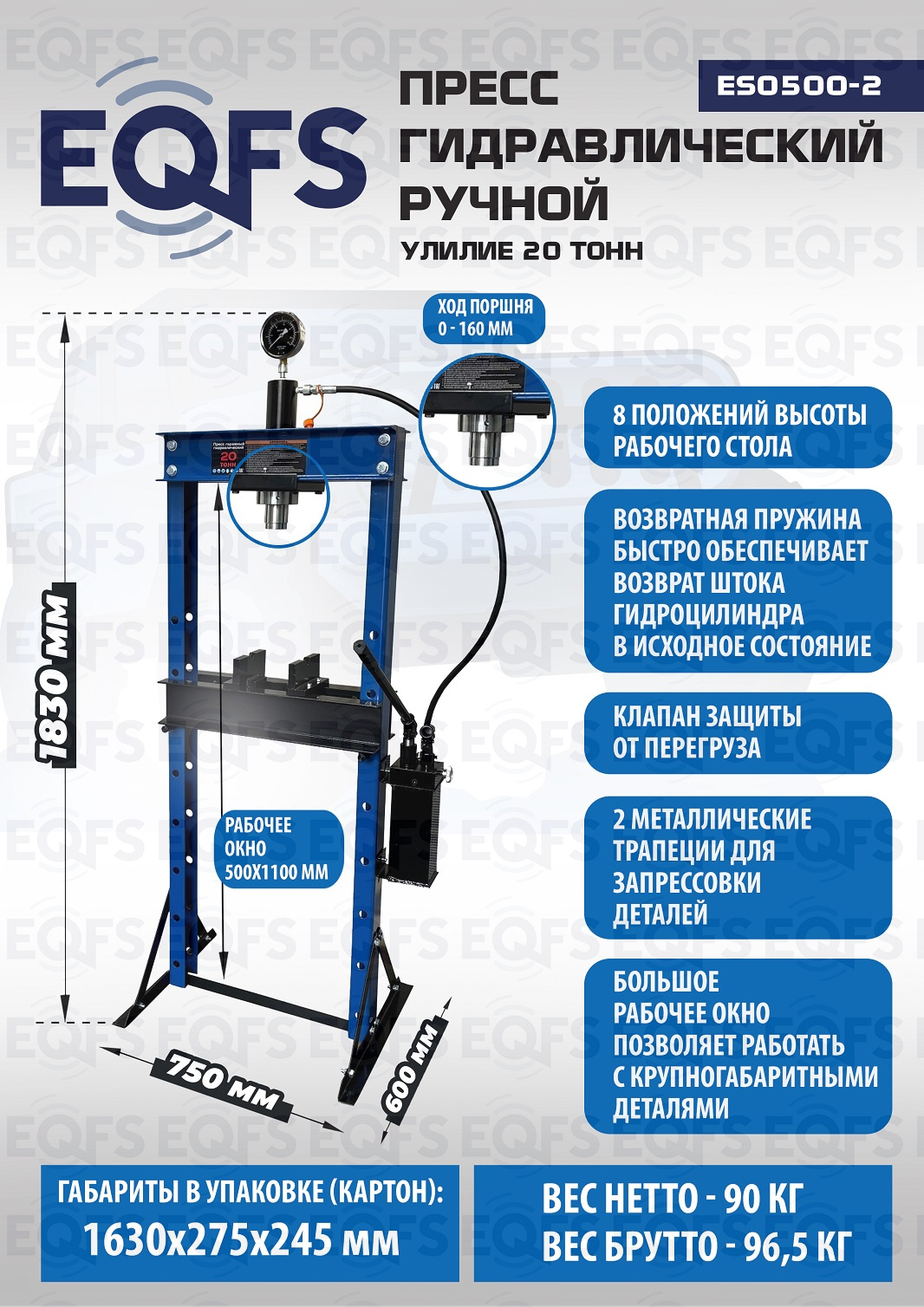 · Пресс укомплектован гидравлическим ручным насосом с максимальным усилием 20т.