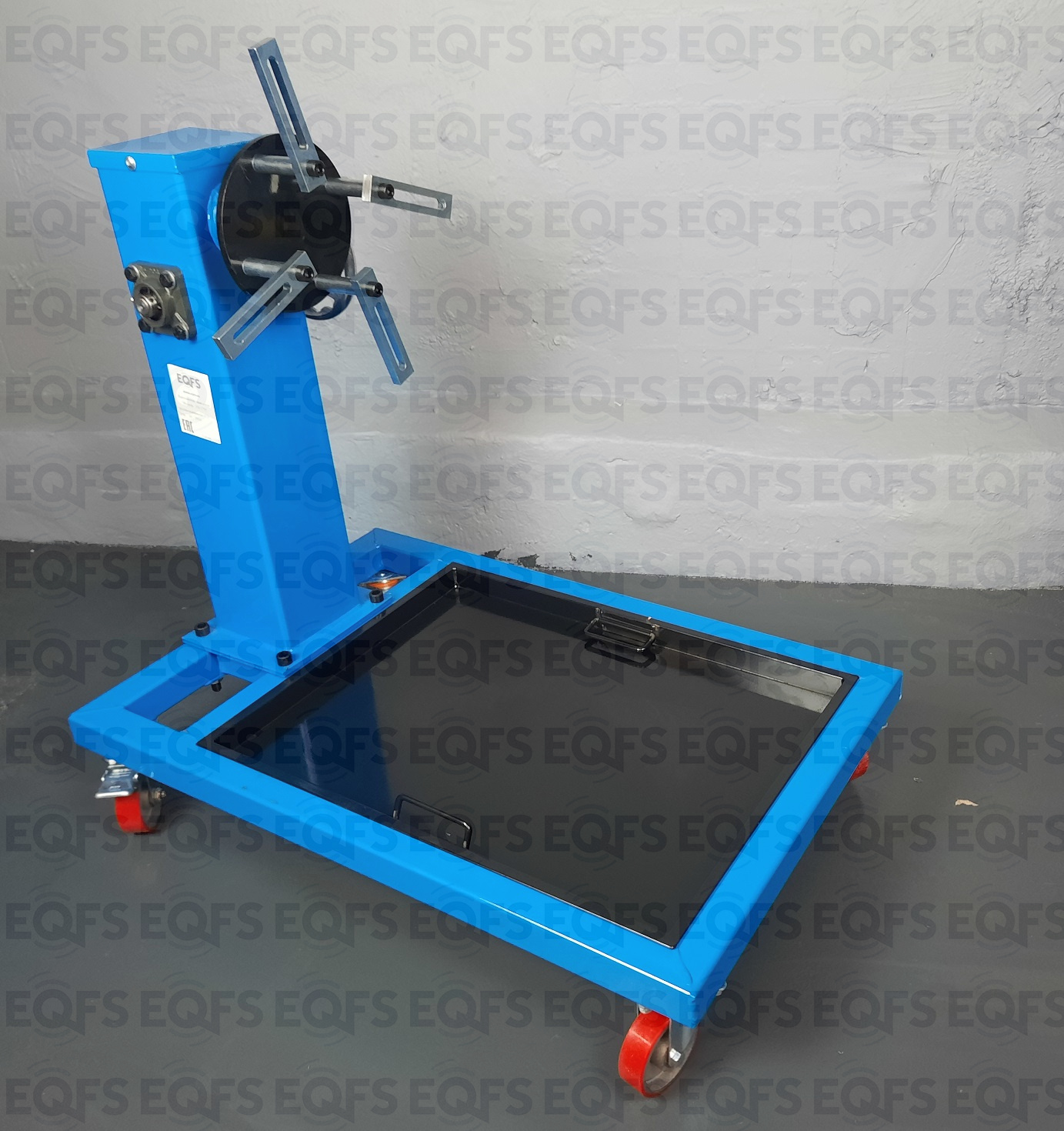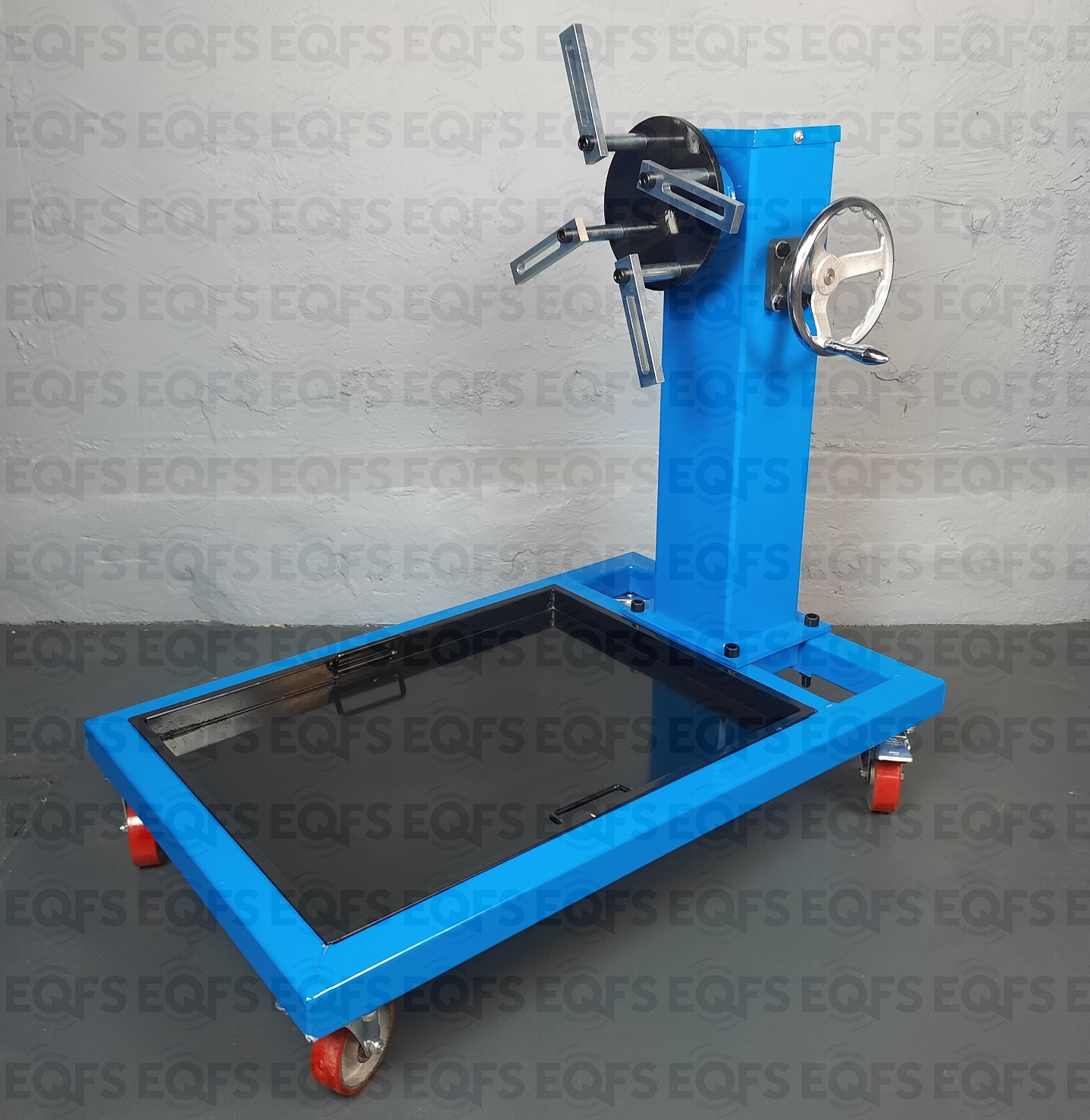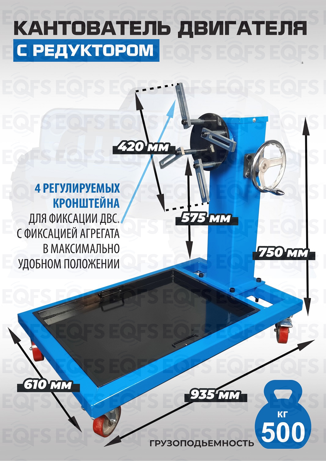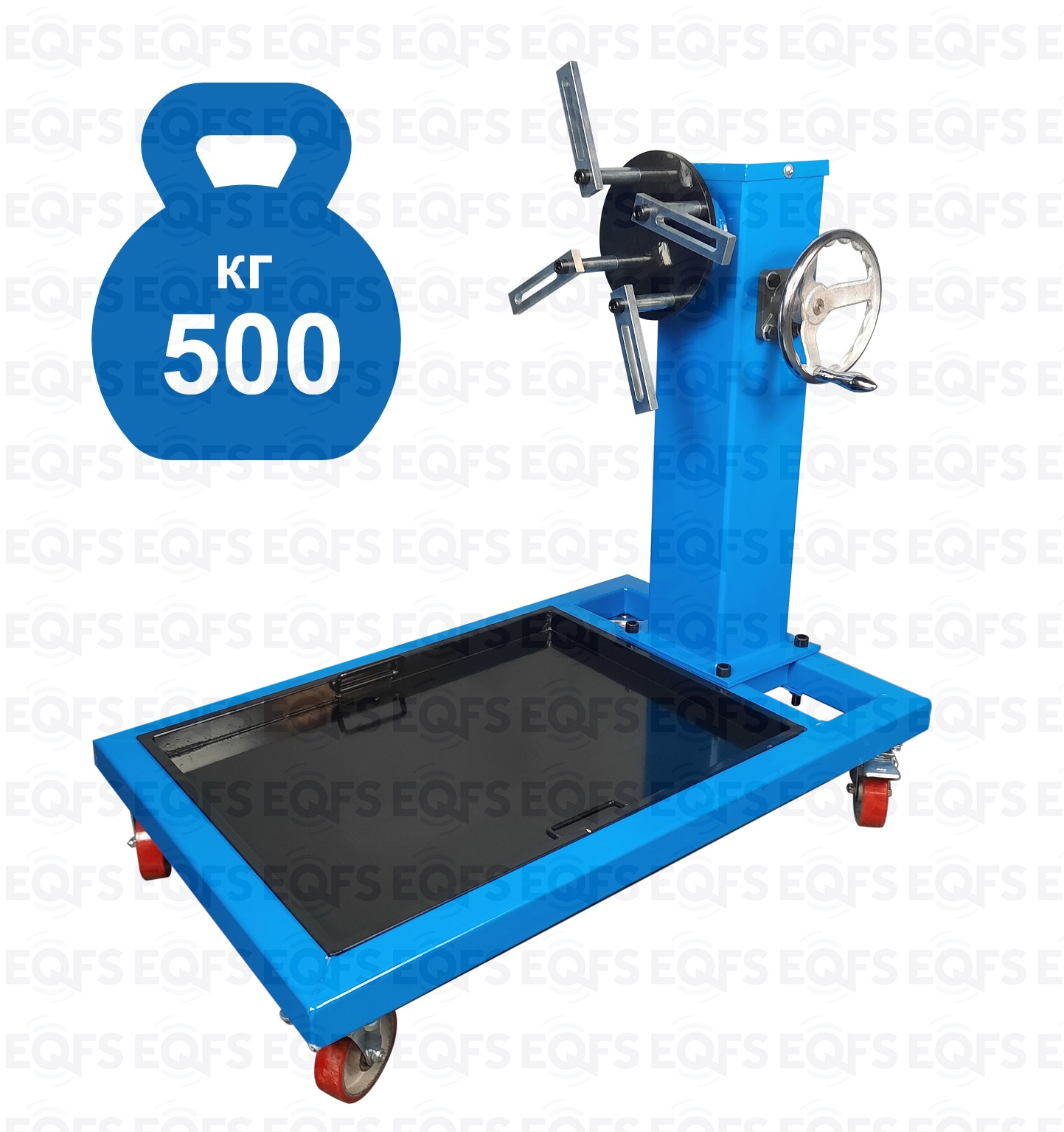 Оснащен редуктором для легкого и быстрого вращения одной рукой. Редуктор позволяет поворачивать вывешенный двигатель под углом 360°. Надежная сварная конструкция и 4 поворотных колеса обеспечивают маневренность и устойчивость к перевороту. В комплекте поддон для сбора отработанного масла. С 4-мя регулируемыми кронштейнами для удобства вывешивания и обслуживания ДВС легковых и легких грузовиков. Можно установить кантователь вплотную к моторному отсеку автомобиля. Для сборки/разборки моторов V6 и V8. г/п: 500 кг.