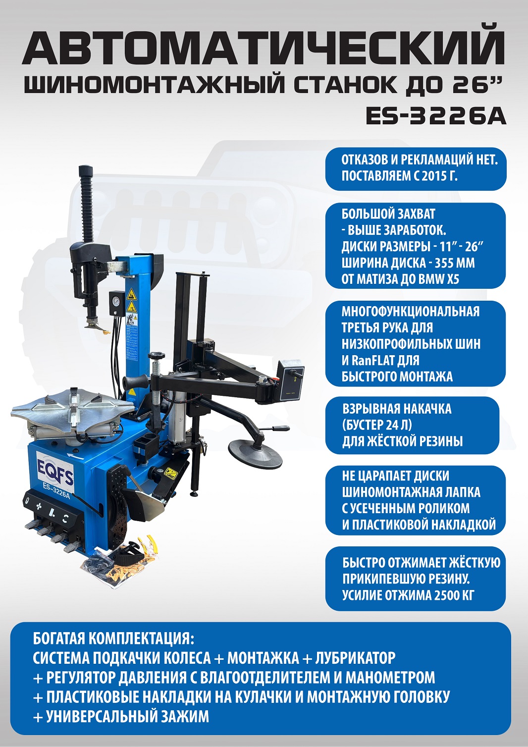 Автоматического шиномонтажного станка ES-3226А. В комплекте взрывная подкачка + «третья рука» для работы с низкопрофильными шинами и RanFlat. Все быстросъемные элементы пневмосистемы выполнены из металла, а не из пластика, что уменьшает вероятность поломки! Зажим 12-26”. Максимальное колесо: Ø 990x355 мм. 220/380В. Масса: 256 кг. Гарантия 12-18 мес. Для покрышек легковых автомобилей, внедорожников, «Спринтеров», «Газелей» и т.п.