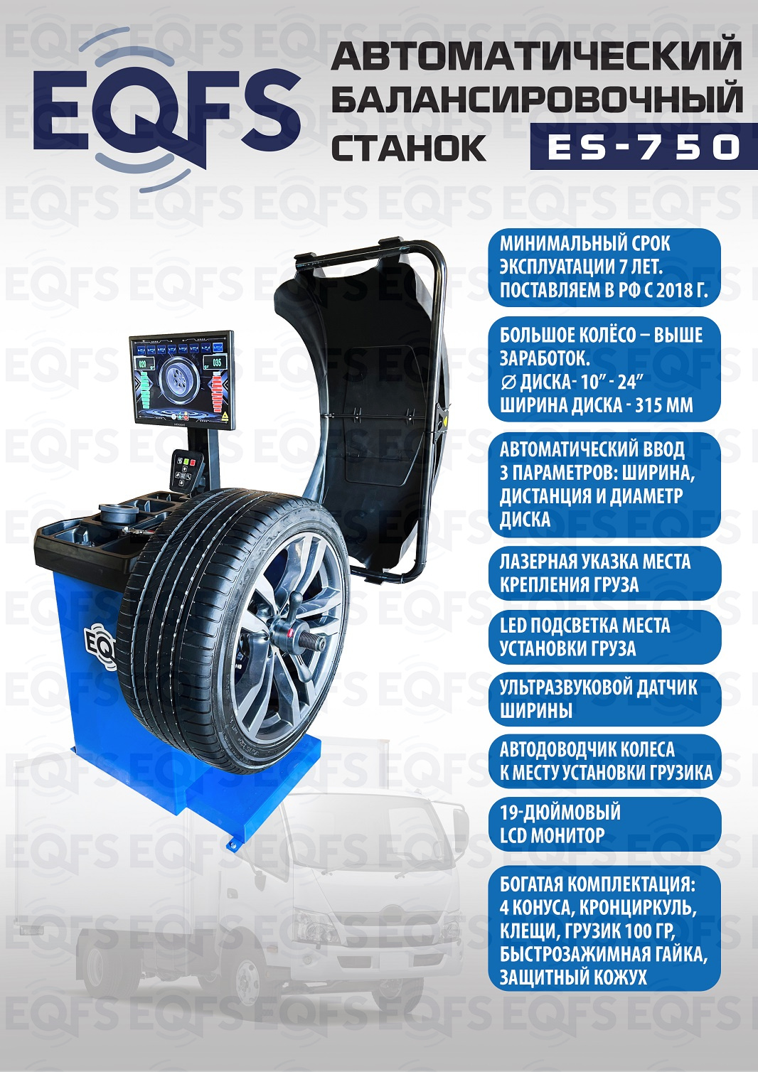 ES-750 Балансировочный станок. Автомат. Для широких колес 315 х R21 от BMW, MB, RANGE ROVER и т.д. Ввод 3-х параметров ( диаметра диска, дистанции и ширины диска), 19-дюймовый LCD монитор с высококачественной 3D-графикой, ультразвуковой датчик ширины. Автодоводчик и лазерная указка места установки грузика. Статическая и динамическая балансировка, ALU-программы для алюминиевых дисков. Программа OPT. Программа разделения и скрытой установки грузиков за спицами SPLIT. Режимы калибровки и самодиагностики. Для балансировки колёс с диаметром колеса до 800 мм. Размеры диска: ширина 3–10” (76-254 мм) , диаметр диска 10–24” (254÷609 мм). Прочный вал Ø - 40мм. Вес колеса 65 кг. Гарантия 18 мес – наш монтаж, 12 мес – самостоятельная установка.