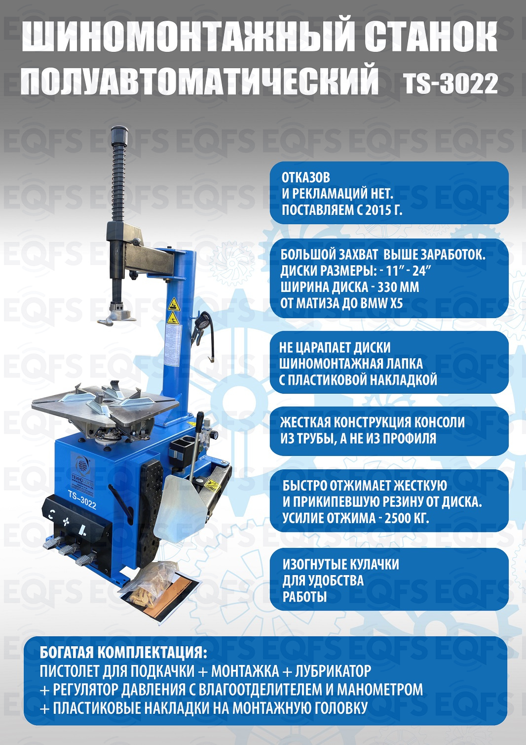 Полуавтоматического шиномонтажного станка TS-3022 предназначен для монтажа и демонтажа колес легковых автомобилей, легких грузовиков, не больших автобусов и коммерческой техники. Внешний зажим 11-21”. Внутренний зажим 12-24”. В комплекте: пистолет для подкачки шин + монтажка + регулятор давления с влагоотделителем и манометром. Рекомендуется для постов со средней и высокой проходимостью. Напряжение шиномонтажных станков 220В или 380В на выбор.