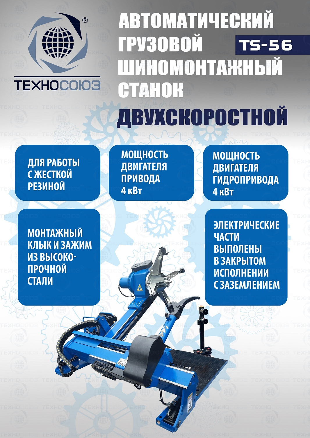 Грузового автоматического шиномонтажного станка TS-56 до 60". Двухскоростной. Моторы 4 + 4 кВт. Гидравлический насос – «BUCHER HIDRAULICS». Диски ALU, сталь, с кольцом и без 14÷60”. Колесо макс. Ø2600 мм, делает колеса "спарку" с шириной диска до 1400 мм. Вес колеса до 2000 кг. Гарантия до 18 мес. Для тракторов, комбайнов, лесной и карьерной техники