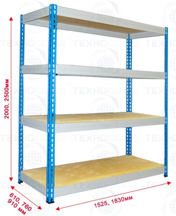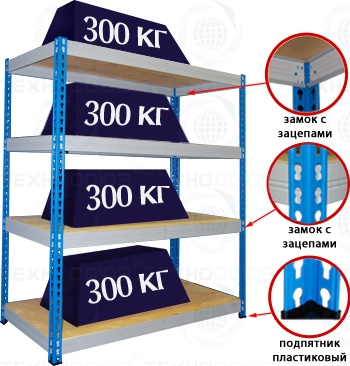 Стойки окрашены полимерной (порошковой) краской RAL 5015 синего цвета или RAL7035 светло-серого цвета, балки окрашены в RAL7035 светло-серого цвета. Шаг перфорации стойки - 50 мм. Полками служит настил из фанеры толщиной 10 мм (серии ФК-10). Стеллаж поставляется в разобранном виде. Балки и стойки упакованы с помощью стрейч пленки.