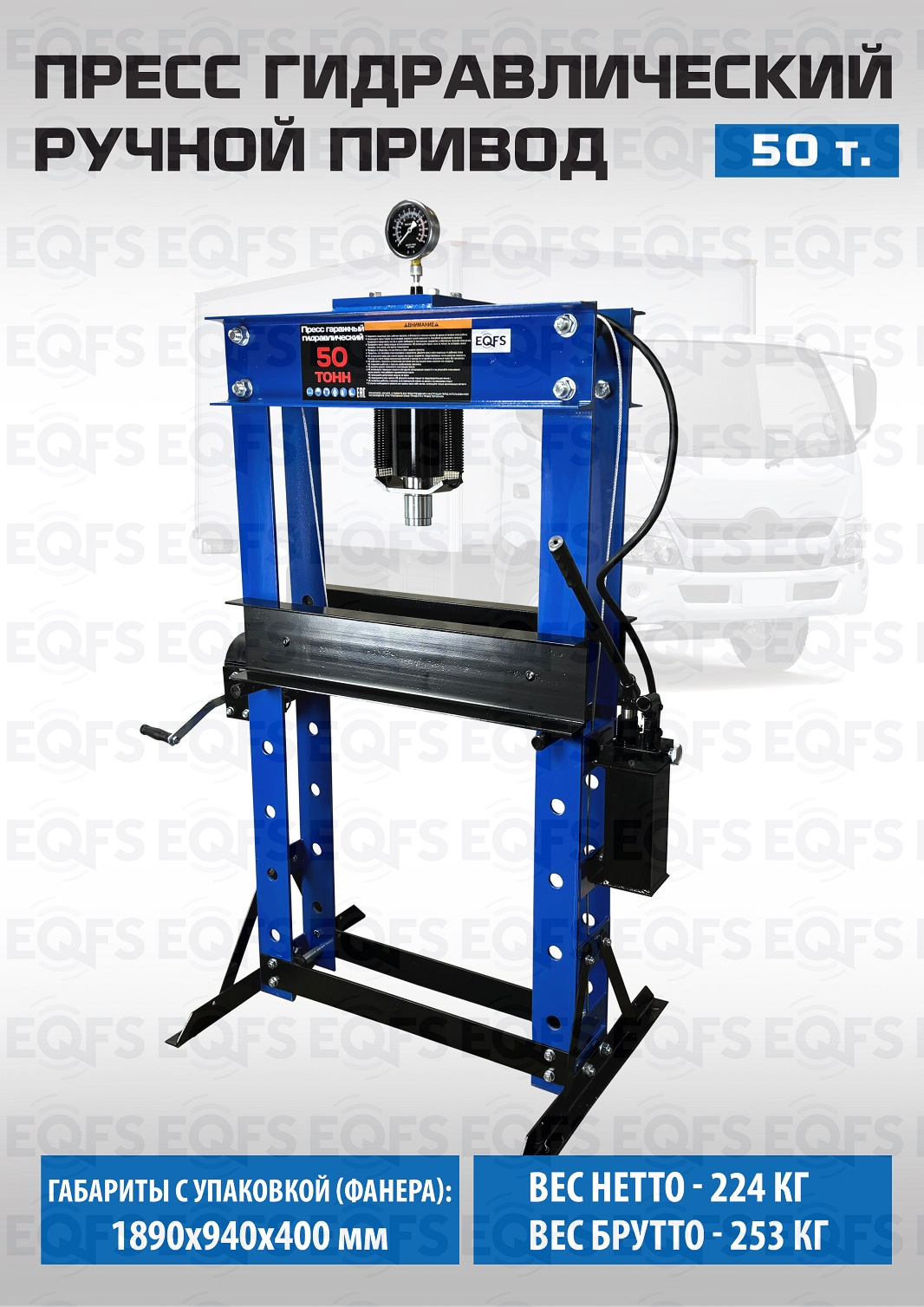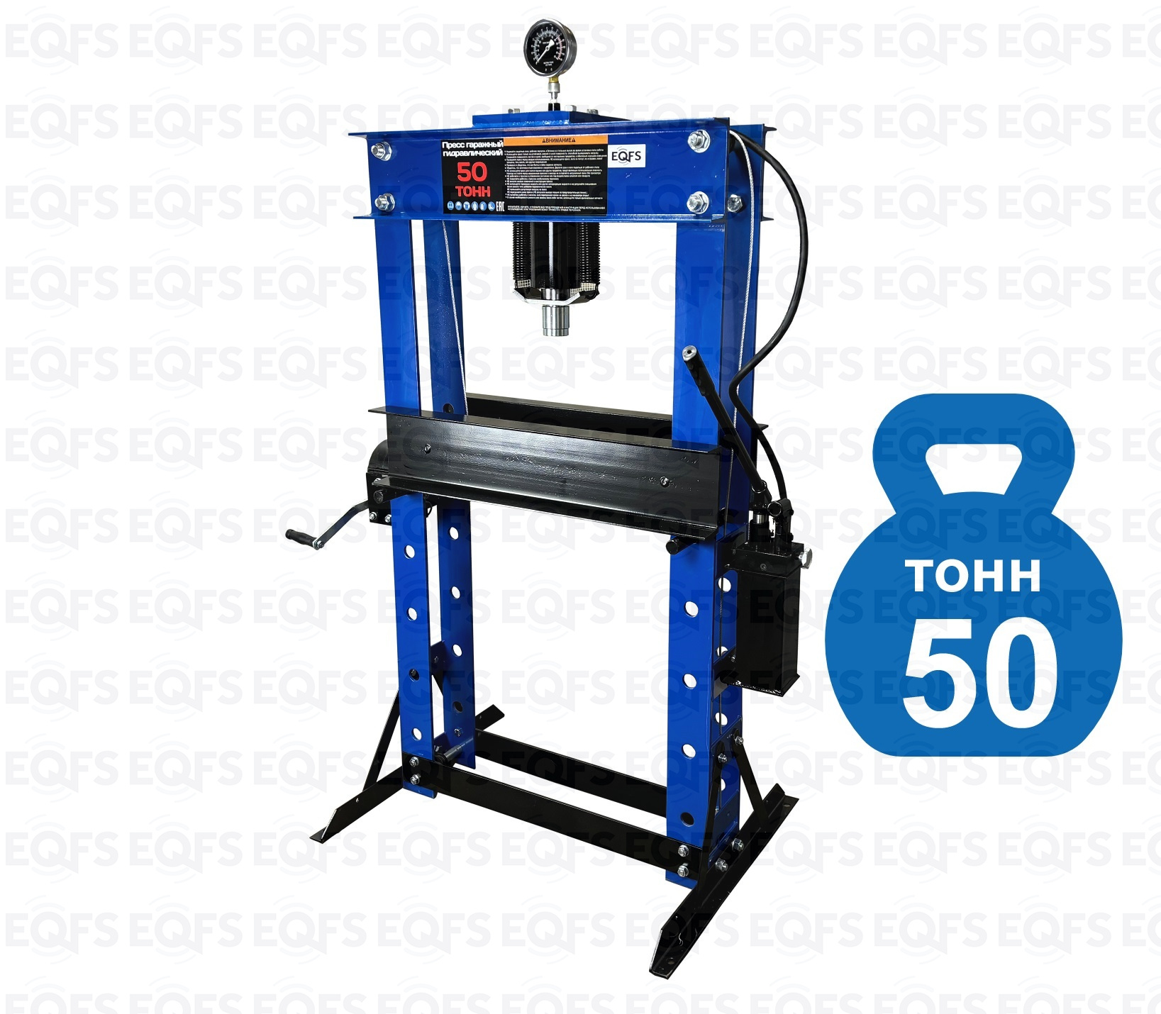 Пресс гидравлический, ручной усилие 50т. Две скорости подачи пуансона. Первая скорость для быстрой подачи штока к рабочей поверхности, вторая (медленно) для выпрессовки. Применяется для запрессовки подшипников, деталей машин и механизмов в гаражах, автосервисах и СТО. Цвет синий.