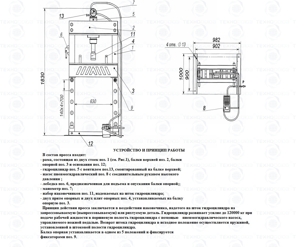 Рама пресса в сборе с гидроцилиндром и насосом ножным с соединительным рукавом высокого давления, шт. |