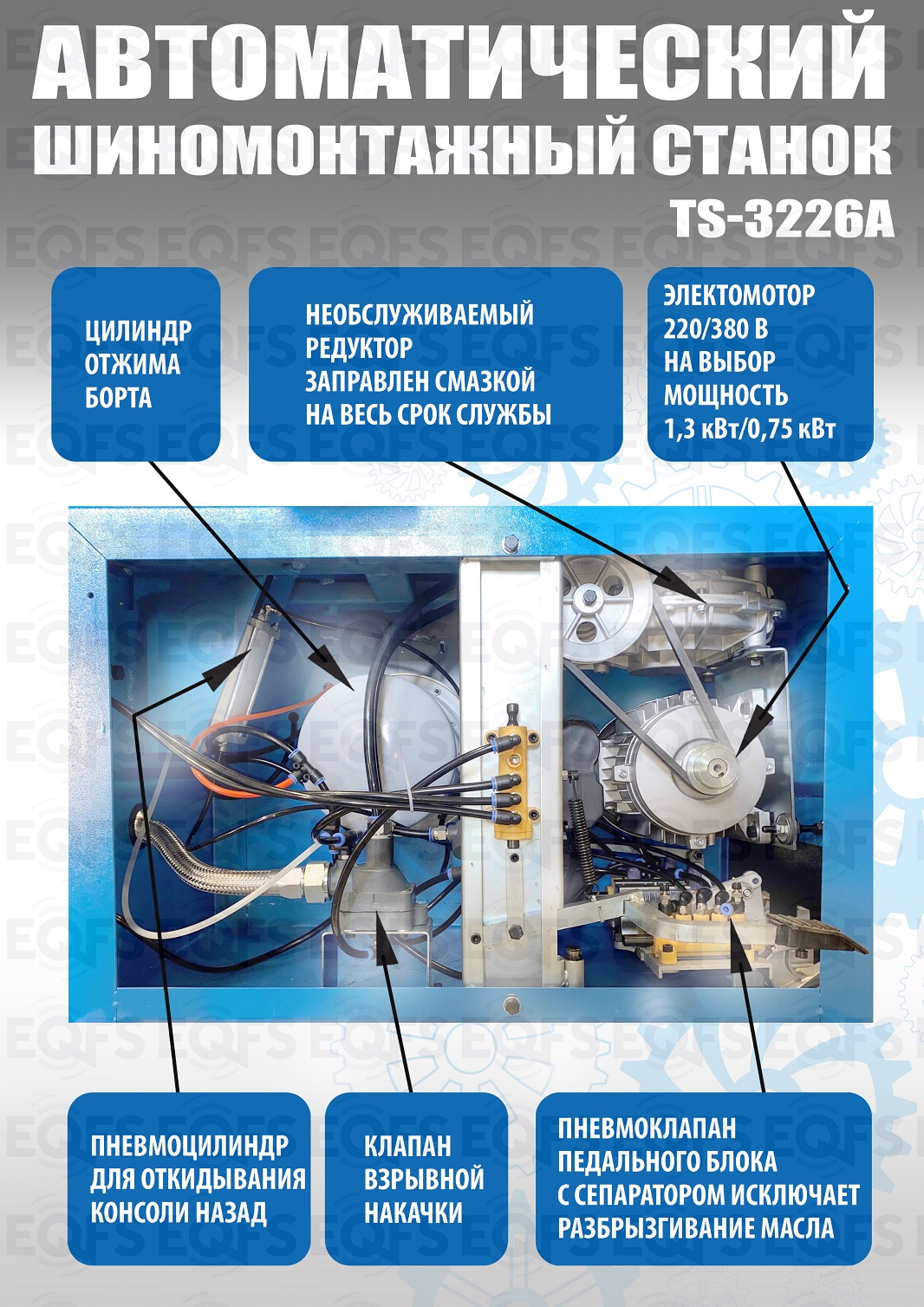 Автоматического шиномонтажного станка TS-3226А предназначен для монтажа и демонтажа колес легковых автомобилей, легких грузовиков, не больших автобусов и коммерческой техники. Для дисков: 11÷24”. В комплекте: полноценная 3-я рука для работы с жесткой и низкопрофильной резиной RUNFLAT. + встроенный бустер  24 литра (взрывная подкачка) + пистолет для подкачки шин + монтажка + регулятор давления с влагоотделителем и манометром.