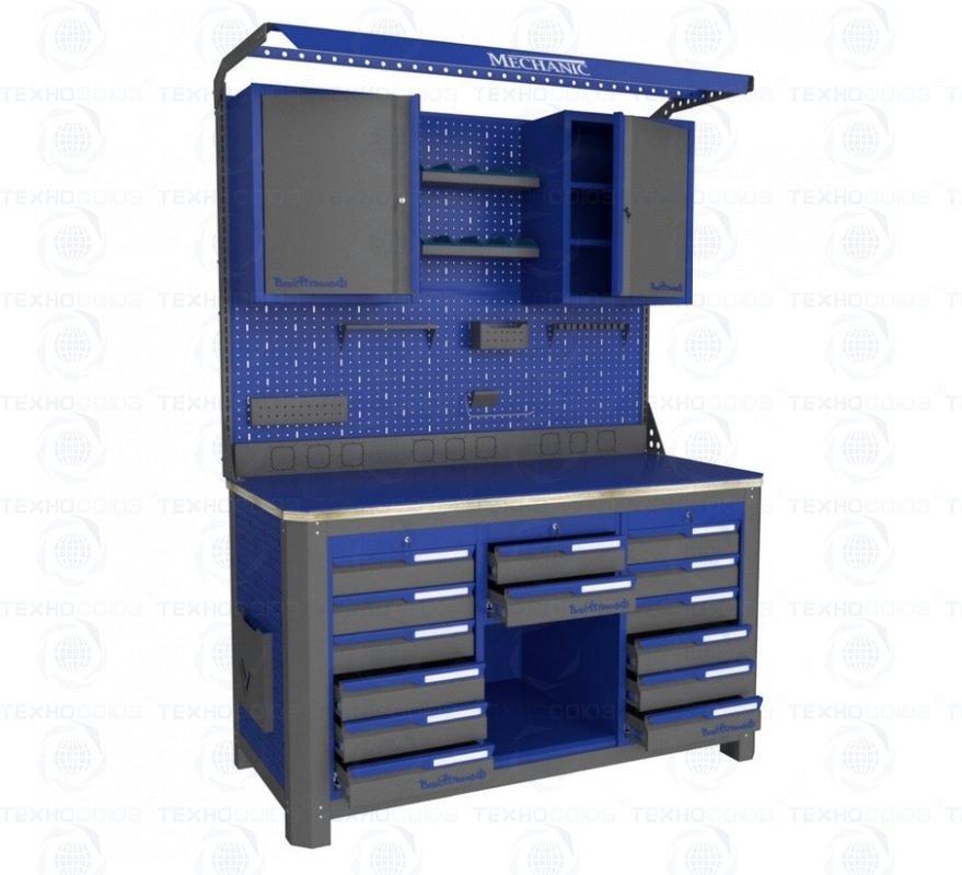 В состав рабочего места входит: Рама (металл 1,5 мм.), столешница (фанера 24 мм. + металл 6 мм.), 2 боковые перфорированные панели, 2 модуля с 6-ю ящиками, модуль подвесной, полка-стенка, блок розеток, комплект усиленных кронштейнов, 2 экрана, козырек с лампой освещения, навесной шкафчик, 2 полочки, 8 пластиковых контейнера, держатель универсальный, держатель для баллонов, держатель для ключей, держатель для отверток, держатель для бумажных полотенцев, кармашек.