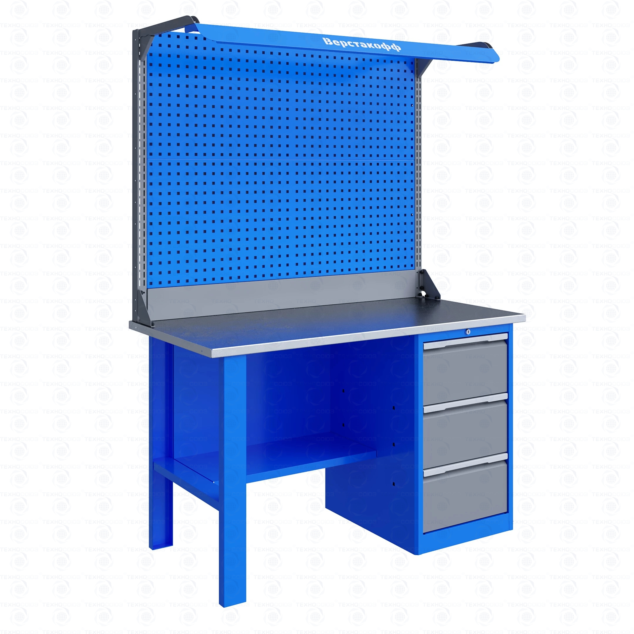 Двойной экран (перфорированные панели) верстака выполнен с квадратной перфорацией 12х12 мм с шагом 38 мм для установки крючков, держателей и других аксессуаров. Экран крепится к столешнице с помощью специальных кронштейнов. Максимальная масса груза, равномерно распределенного по поверхности экрана, составляет 21 кг.